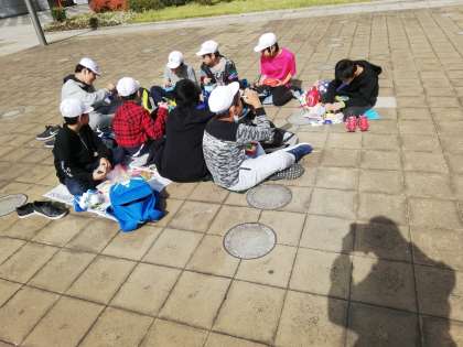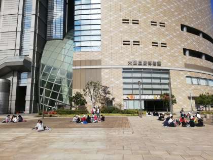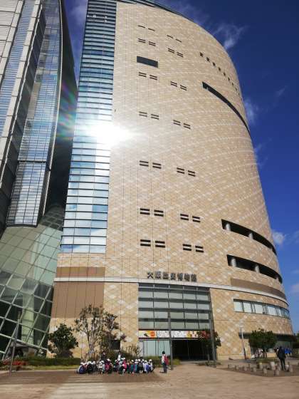 「大阪歴史博物館」に着き、昼食です。子ども達の近くの地面の丸い形は、難波宮の柱の位置を表しています。
