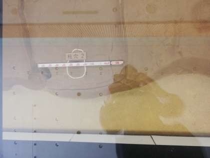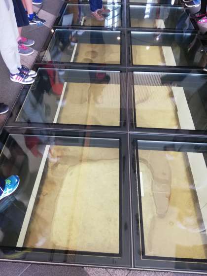 「大阪歴史博物館」の見学は、ガイドさんの難波宮遺跡巡りです。床の丸い形は、難波宮の柱の位置を表しています。