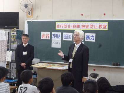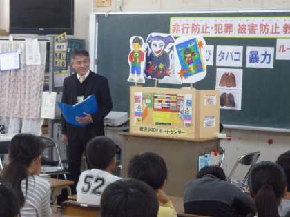大阪府少年サポートセンターより担当者の方に来ていただき、たくさんのことを教わりました。講話を通して、携帯電話・スマートフォンによるメールやラインの正しい使い方について、人権の観点から注意することを学びました。また、紙芝居を通して、犯罪の誘惑に負けないようにするにはどうしたらよいか、主人公が心の葛藤で揺れ動く演技を見ながら対話形式で学習しました。