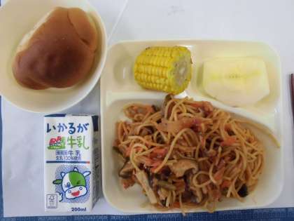 なお、今日の給食は「きのこのスパゲッティー」「焼きとうもろこし」で、デザートにりんごが出ました。