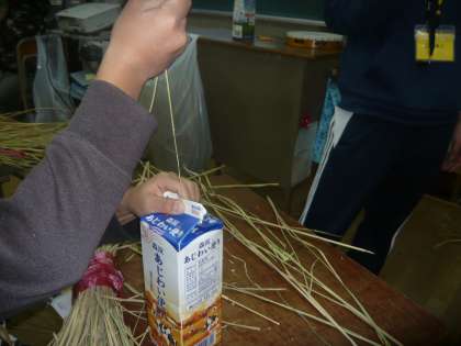 11月22日 今日は、乾かしていた稲の脱穀作業を、教室で行いました。牛乳パックを使った方法です。手順は、1、牛乳パックの口の中に稲のもみの部分を入れて口を閉じ、手で押さえる。2、もう片方の手で稲の茎を引っ張る。3、種もみが稲からはがれて牛乳パックの底におちる。という工程です。作業に慣れてくると、楽しそうなにぎやかな声があちこちからたくさん聞こえてきました。
