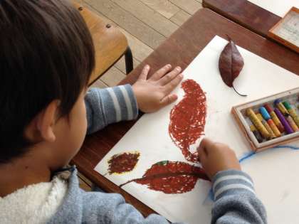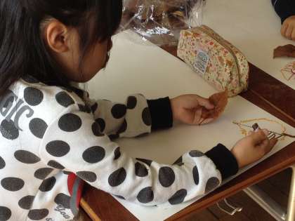 2年生は集めてきた落ち葉をもとに絵をかいていました。様々に色づいた落ち葉の色を感じながら、クレパスをはしらせていました。秋も深まり、とっても寒くなってきました。