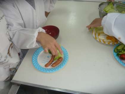 ハンバーグはソースとよく絡み、火がよく通ります。火を使う作業が終わり、サラダの盛り付けをしていきます。色合いや見た目を意識して、工夫していました。