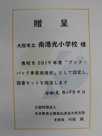 12月4日(水)、公益財団法人 「日本教育公務員弘済会」により「ブック・パック事業推進校」に本校が認定され、最新の絵本セット37冊をいただきました。職員朝会で贈呈式を行い、絵本が学校に届きました。写真の本は37冊のうちの1冊です。子どもたちの読書活動に活用し、言語力の育成を進めていきたいと考えています。