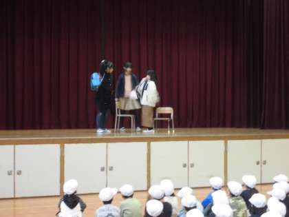 12月12日(木)、児童放送委員会の発表がありました。放送委員会は休み時間や昼休み等で丁寧に放送していますが、声は聞こえても放送している様子をみんなが目にすることはほとんどありません。そこで、今日の発表は、放送している様子を劇で表現して、みんなに知ってもらうという内容でした。声だけでなく姿もみんなに見てもらって満足そうでした。