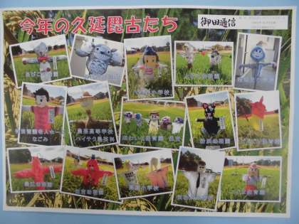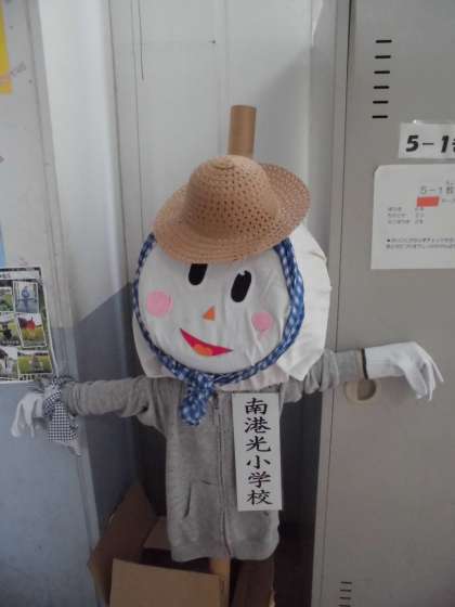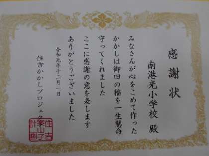 12月18日(水)、個人懇談会は2日目をむかえました。5年生の教室の前にはかかしが懇談会に来られた保護者の方をお迎えしています。このかかしは5年生の子どもたちが作成し、住吉大社の御田の稲を守ってきました。稲の収穫が終わり、本校に帰ってきました。作風が可愛らしく好評だったため、他校へ招かれて見本にもなったそうです。ご覧のように感謝状と御田通信もいただきました。(御田通信の右上に本校のかかしの写真が載っています)