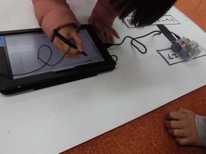 4年生がプログラミング教育に取り組みました。社会科「日本各地と世界を結ぶ」の学習で、ニュートラムの路線図を模した模造紙の上を、正確に走行ロボットを動かす学習です。まずは、コンピューターに自分たちで考えたプログラムを送信します。