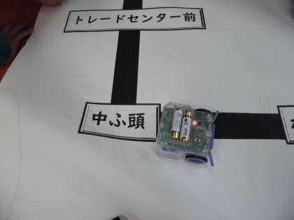 実際に走行させました。次の駅まで何秒で走行するのか、グループで考えてプログラミングしていました。駅には5秒停車します。角を正確に曲がるプログラムはとても難しく、何回もプログラムを変更していました。うまく曲がった時は、みんな大喜びです。