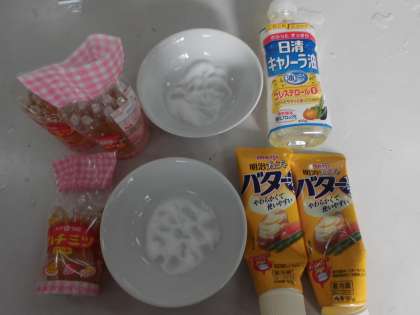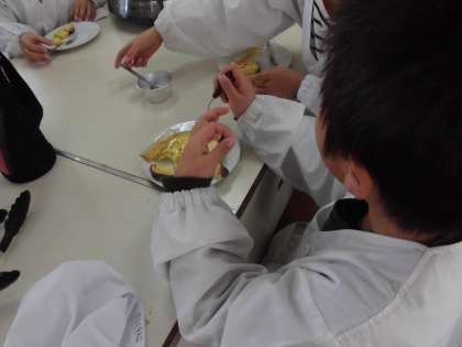 味付けはご覧のように、塩・砂糖・バター・はちみつです。自分の好みで味をつけていました。味はとても甘くおいしく食べることができました。子どもたちはみんな大満足でした。