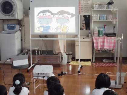 3学期になって1週間がすぎました。今日から発育2測定(身長・体重)が始まりました。測定前の学習は2年生は「うがい」についてです。「うがい」についての楽しい歌を教えてもらい、「うがい」の大切さを学ぶことができました。