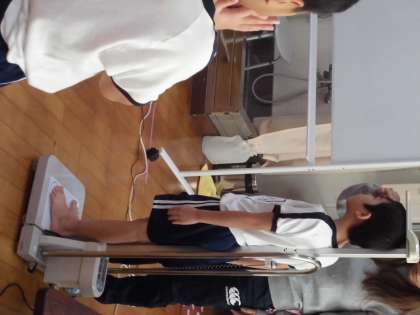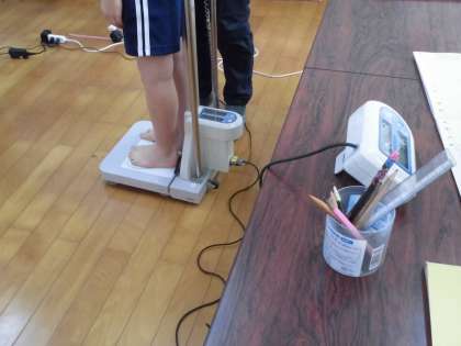 写真の測定器は身長と体重を同時に図ることができ、モニターに数値が表示されるため、児童に数値が知られることなく、担任は測定結果を記録することができます。
