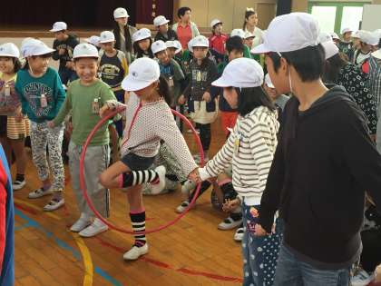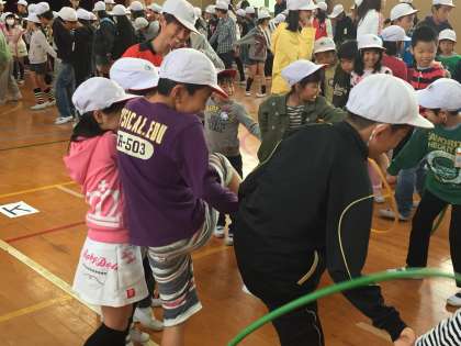 朝、たてわり集会をしました。体育の輪を手をつないだまま順にくぐっていくゲームでした。けっこうむずかしくて、苦労している班もありました。