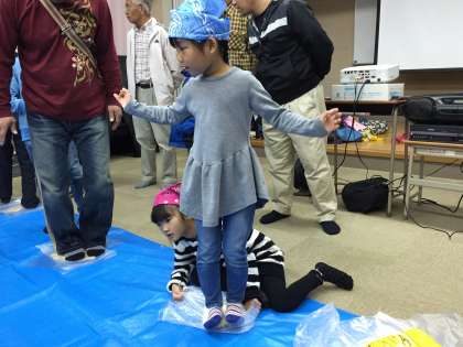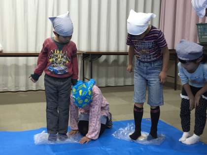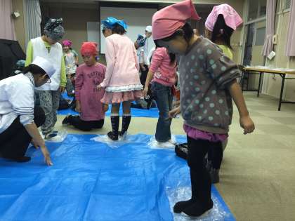 うどん生地は足で踏んで伸ばします。みんなとっても楽しそうでした。