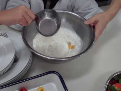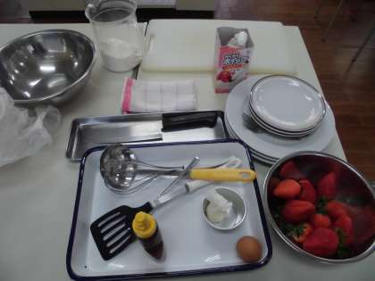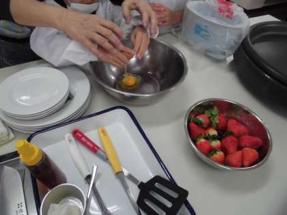 2月4日(火)、ひまわり学級で「パンケーキ作り」をしました。材料はご覧の通りで、まず卵を割り、生地に炭酸水を混ぜます。卵を割るのはむずかしかったです。