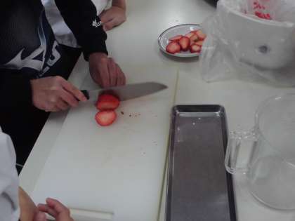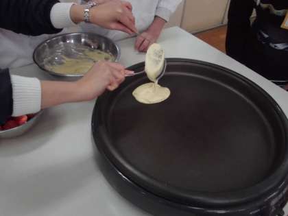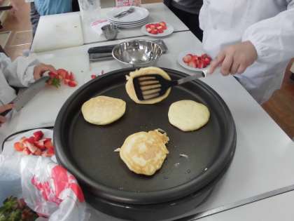 生地をホットプレートに入れ、焼けてきたらひっくり返します。その間にイチゴを切っていきます。