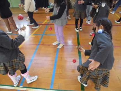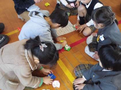 1年生は「折り紙」「けん玉」「こま」のコーナーで、園児に遊びを教えてあげました。優しく丁寧に教えている姿から1年間の成長を感じました。園児も遊びをとても楽しんでいました。