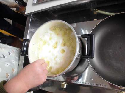 煮あがったジャガイモをつぶしていき、こねます。適度な大きさの形を作るのも難しいです。