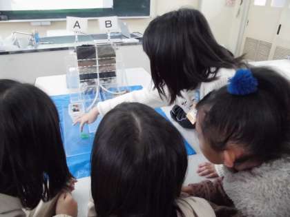 2月7日(金)、4年生はサントリー社の協力で「水育」の学習をしました。「水を育む」「水を大切にする」「将来にわたって水を使えるようにする」等々。これらのことについて実験をしながら考えていきました。実験装置のAはろ過機能がある地層の模型で、Bはろ過機能のない地層の模型です。