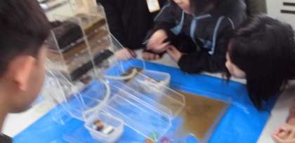 AとBに濁った水を注ぎます。Bは汚水がそのままろ過されずに排出されます。写真ではわかりにくいですがAはろ過されてきれいな水が排出されます。