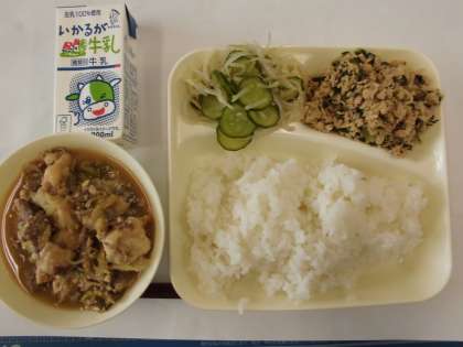 今日の給食は「すき焼き煮」「もやしときゅうりのしょうがづけ」「ツナっ葉いため」でした。ツナっ葉はご飯にかけて食べます。ご飯によく合う味付けでした。