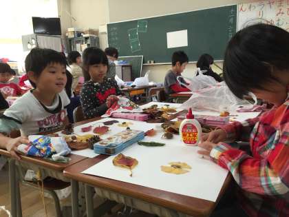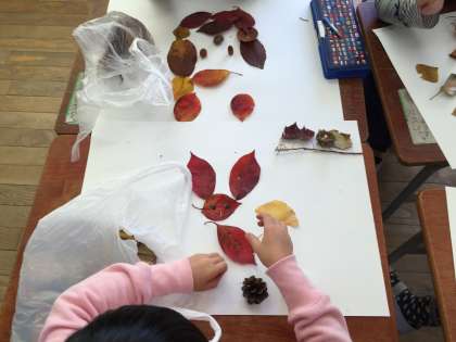 ゆく秋が時を惜しむように、1年生の教室にやってきました。落ち葉や木の実が、ロンドを踊っているような時間でした。