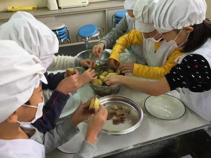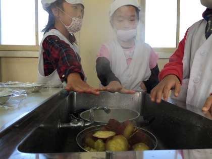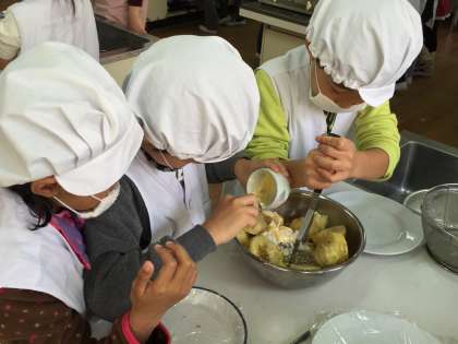 2年生は収穫したさつまいもで、スィートポテトを作りました。まず、ゆでて、皮をむきました。続いてバターとお砂糖を混ぜてつぶしていきました。