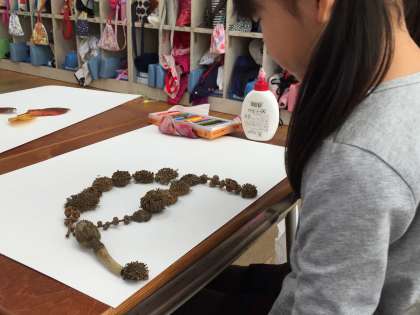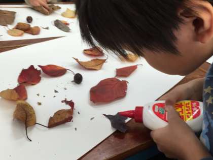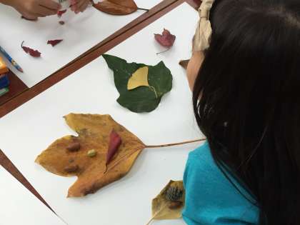 落ち葉にどんぐりをのせたり、重ねたり。小さな手から豊かなイメージが、次々とあふれてきました。
