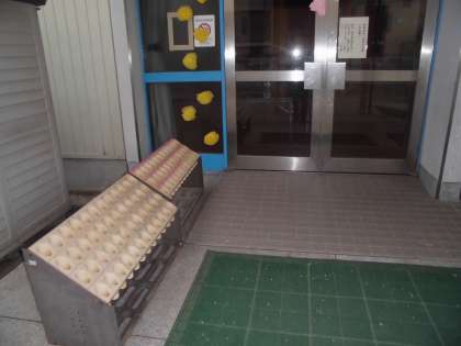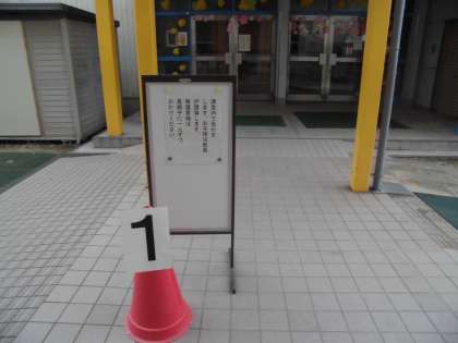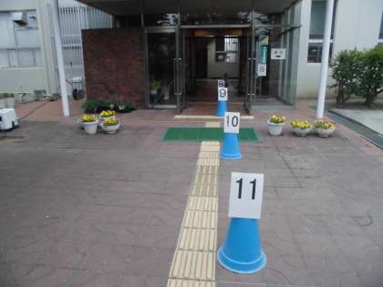 来校されたら、コーンに沿ってお進みください。コーンに保護者、児童がいましたら、手前のコーンでお待ちください。受け付けは講堂内です。雨が降っていましたら入り口前に傘立てを用意しております。児童名を書いていますのでよろしくお願いいたします。講堂を入ってすぐ左手に消毒液を用意しておりますので。手指の消毒をお願いいたします。講堂内でお子様を教員が席に誘導します。保護者の方は長椅子に一人ずつおかけください。