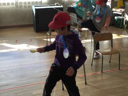 2年1組の、落としちゃだめだめ!。スプーンにモノをのせて、ひもを越えていくのは、なかなかの難関でした。
