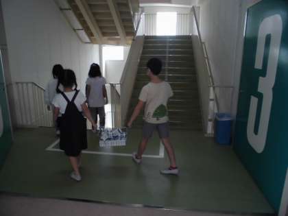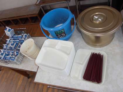 午後班は、午前班が下校後に登校します。午前班の下校後の消毒の時間が十分とれないので、午前と午後で別の教室を使います。手を洗い、午後分のおかずと牛乳を取りに行きます。食後は食器をまとめ、午前班の食器とおかずの食缶を一緒にして午後班が返却します。