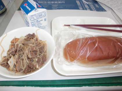 今日の給食は黒糖パン、牛乳、そして大人気のすき焼き煮です。パンは飛沫を防ぐため一つずつ包装されています。