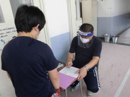 フェイスシールドの職員用が配布され、使い始めました。健康チェックや児童と接近する配膳時や個別指導等で使用しています。