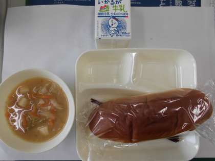 今日の給食は牛乳、パンプキンパン、みそ汁です。