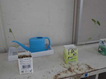 5年生が実験していたインゲン豆が伸びてきました。水を入れないカップは芽が出ないので、発芽に水が必要なことがよくわかりました。3年生はホウセンカ、マリーゴールド、ヒマワリの種のうち、好みの種をまきました。成長が楽しみです。