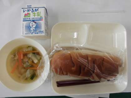 今日の給食はおさつパン、牛乳、中華スープでした。中華味の風味がよく、おいしくいただけました。