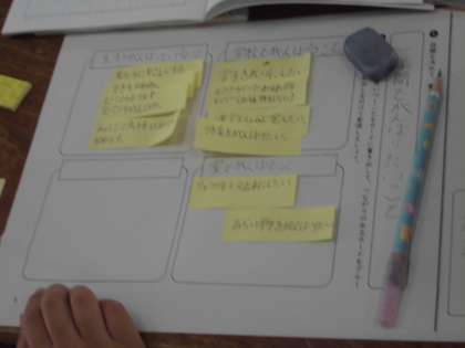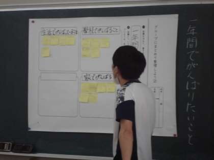 4年生は国語「グループにまとめて整理しよう」の学習で、1年間でがんばりたいことについて自分の考えをまとめていました。がんばりたいことを付箋に書いてプリントに貼り、そのうちの1枚を黒板に貼って交流しあいました。