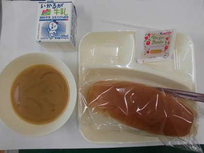 今日の給食はコッペパン、牛乳、みそ汁でした。パンにはリンゴジャムがつきました。