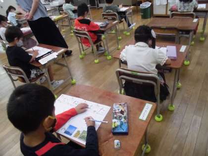 6月12日(金)、最後の分散登校です。1年生はひらがなを丁寧に書いていました。姿勢よく書いていて担任の先生に褒められていました。2年生の算数では、できた課題を添削してもらいました。3年生はドリルに赤ペンで〇をつけてもらいうれしい顔がいっぱいでした。