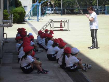 6月17日(水)、1年生は初めて体育の学習をしました。整列や体育すわりでの話の聞き方等、とてもうまかったです。教室を見るときれいに服をたたんで机の上に置いていました。