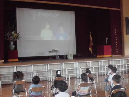 式の後、児童会の6年生がビデオ出演しました。お祝いメッセージと学校の説明、そして学校についてのクイズです。クイズは1年生も参加しました。雨が続いて天気が心配でしたが、晴れ間が見られ、絶好の入学式日和になりました。校門前での記念撮影の顔はみんないい笑顔でした。これからも全教職員でしっかりとみていきます。