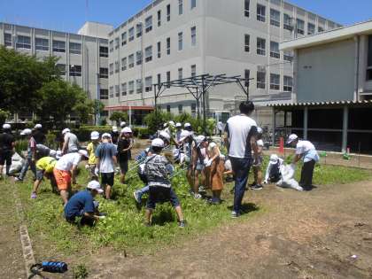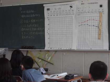 4年生はへちまとかぼちゃを育てています。今日は暑い中、草抜きをしました。教室では、先週、晴れの日と雨の日に測った気温について考察しました。気温の差ははっきりしており、子どもたちは自分の考えをノートに書いていました。
