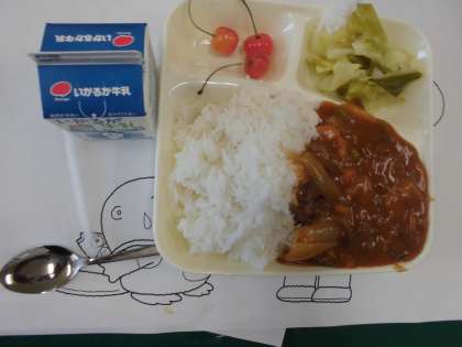 今日の給食は「ハヤシライス」「キャベツのゆずドレッシング」とデザートにサクランボがでました。「ハヤシライス」は人気の献立で、1年生は初めて食べました。