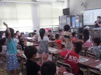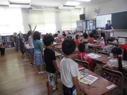 6月24日(水)、1年生は算数で「なんばんめ」を学習しました。写真は「前から4番目」、「左から4人」をグループで実現している様子です。この学習は間違いやすく、子どもたちはしっかり考えながら学習していました。