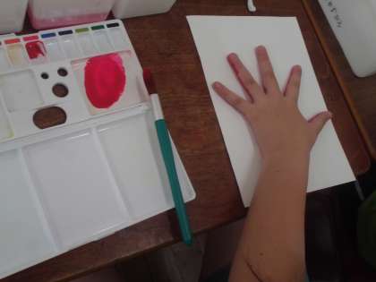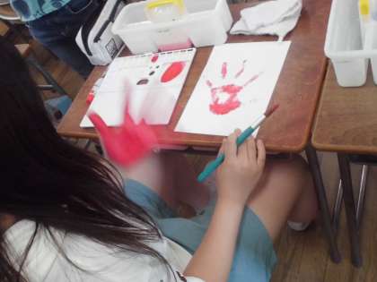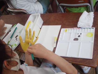 3年生は手のひらに絵の具を塗り、画用紙に当てて型をとりました。できた作品は教室の掲示に使います。