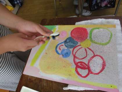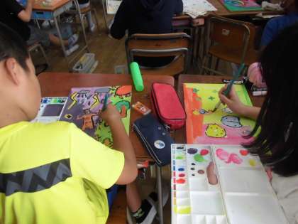 4年生はパソコンで調べ学習に取り組みました。教室では図工で「コリントゲーム」の板に絵の具で絵を描きました。歯ブラシで絵の具を細かく飛ばすなど、感心させられる工夫も見られました。