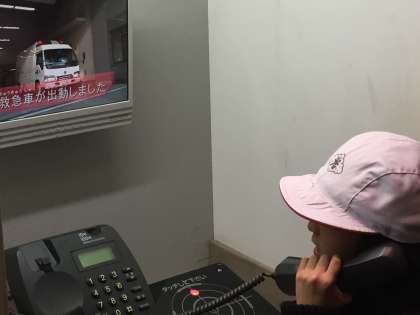 消火器での消化活動、119番通報、けむりが充満する廊下の歩行を体験をしました。
