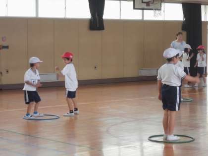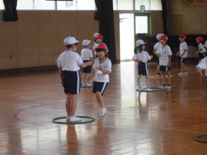 早くも7月になりました。1年生は体育館で楽しく体育の学習です。体作りのジャンケンゲームで、赤白チームで対抗します。5列になった相手チームと1列ごとにジャンケンをして勝ち抜いていきます。5連勝すると味方に1点が入ります。楽しみながら足を鍛えていました。