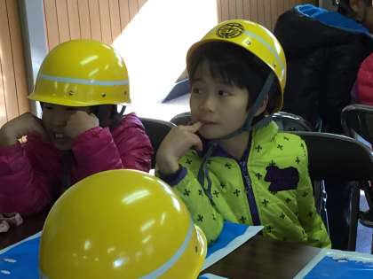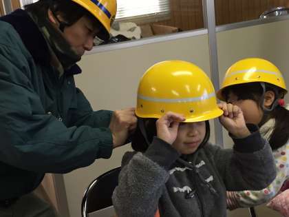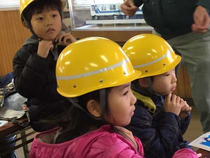検車場ではヘルメットをかぶって見学します。みんなとっても似合っていました。