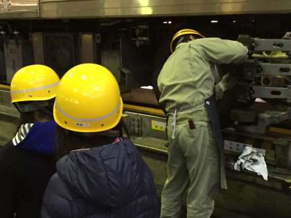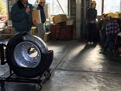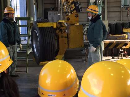 タイヤの整備や交換をする様子も見学しました。1本が120kgもあるタイヤも機械を使うと、一人で動かすことができるそうです。