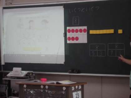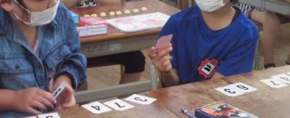 1年生は算数で「いくつといくつ」を学習しました。今日は隣りのお友達にカードの数字を見せて「8」になるカードを出させる活動です。わからないときはブロックを使って考えました。